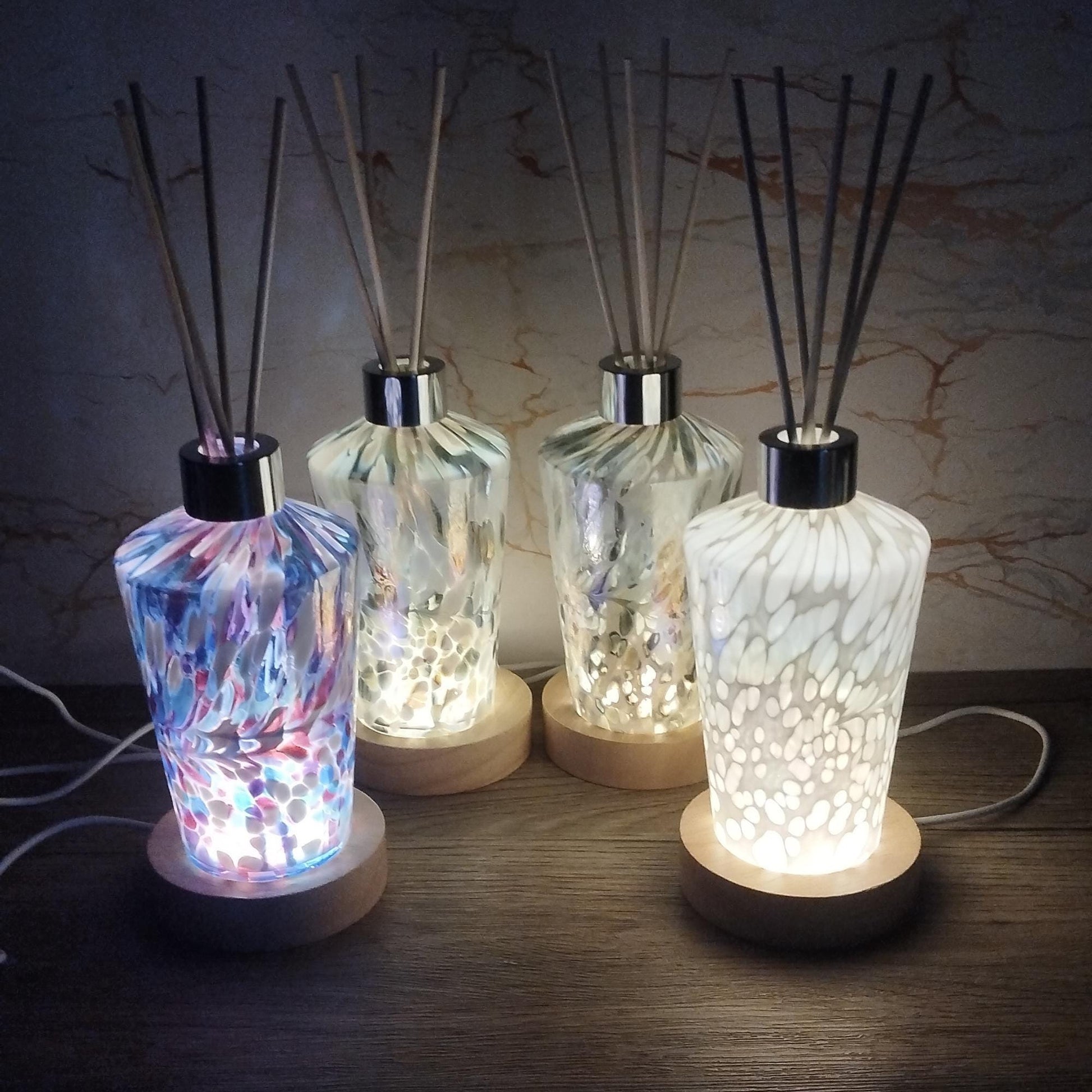 Add a touch of elegance to your home with our Handcrafted Glass Diffuser Bottle Lamp with LED Light, a unique combination of artistic design and practical functionality. This stunning diffuser not only fills your room with delightful aromas but also serves as a glowing LED lamp, perfect for creating a cosy atmosphere. Handmade from high-quality iridescent glass, this diffuser lamp is a statement piece that complements any interior. Whether used as a decorative lamp, an aroma diffuser, or both, it offers the perfect balance of beauty and utility.