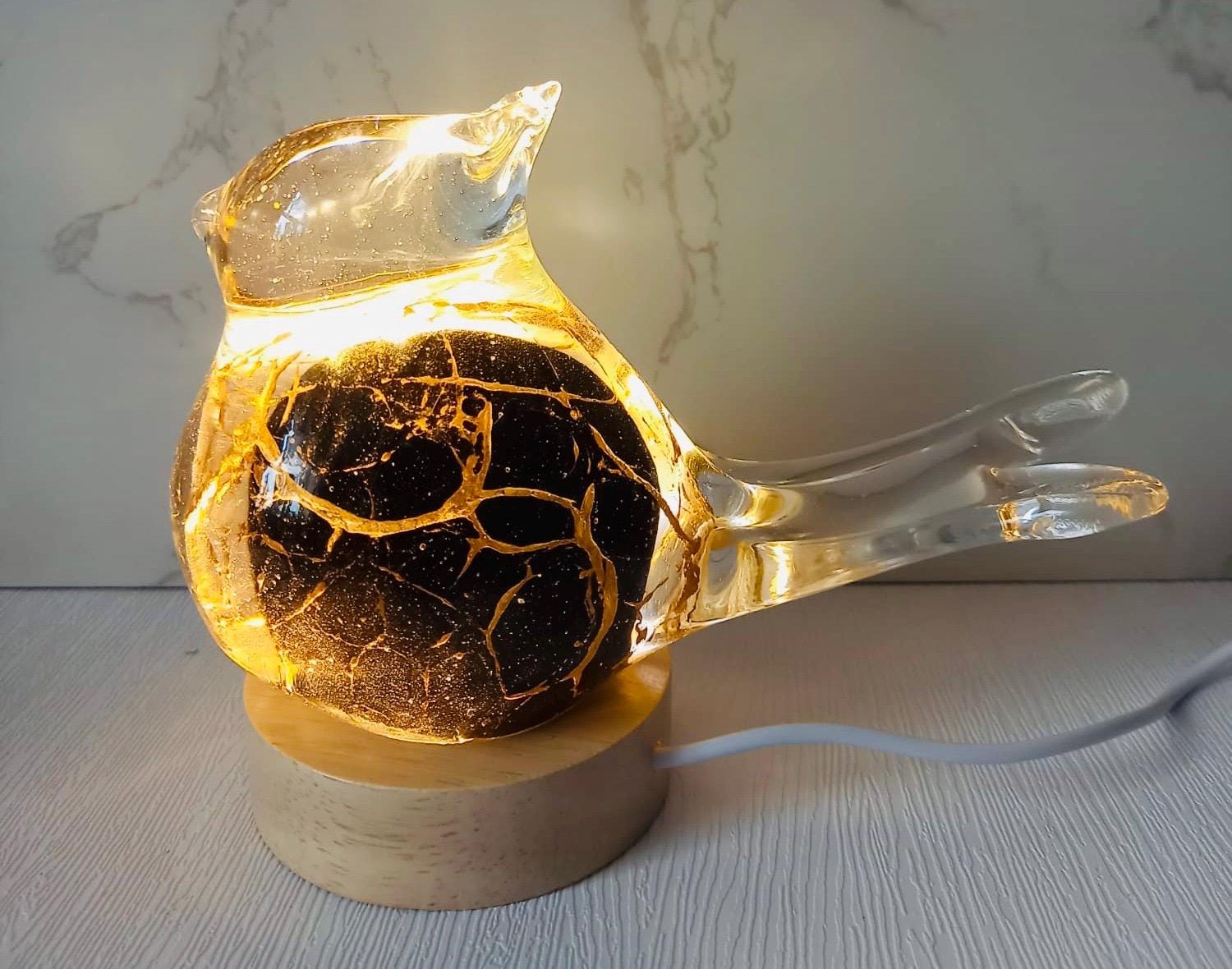 💡 Details: Material: Hand-blown iridescent glass Style: Bird design with iridescent finish Light source: LED (energy-efficient) Power: USB cable connection
